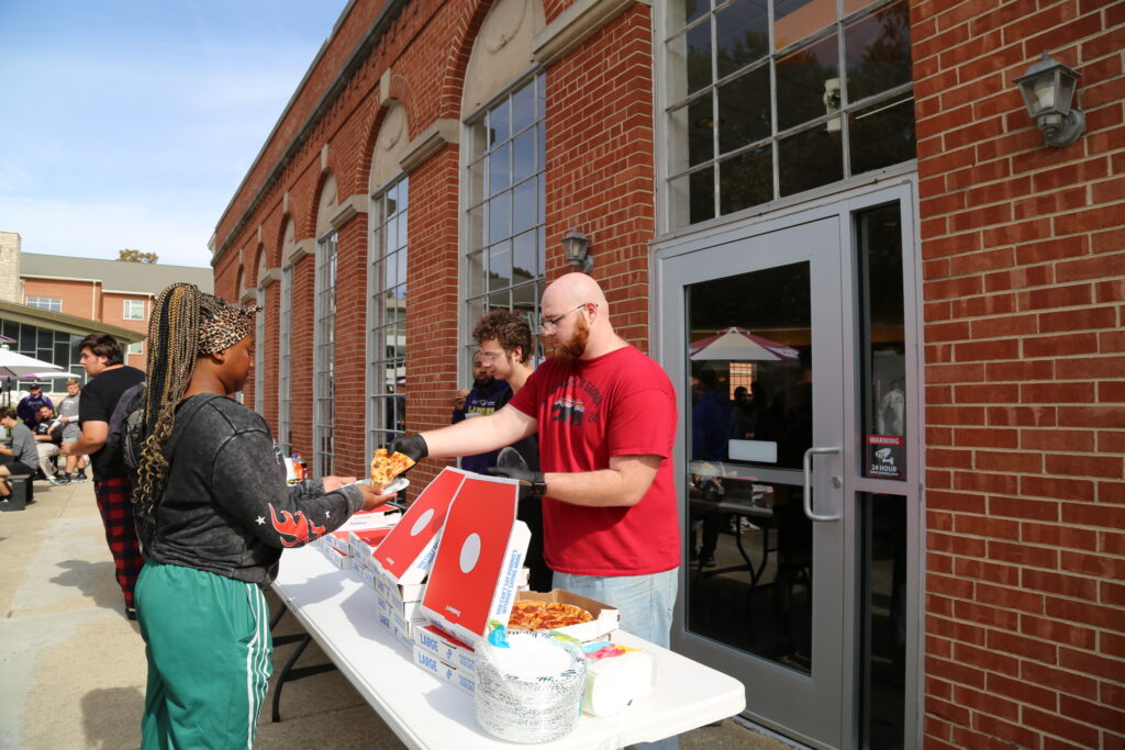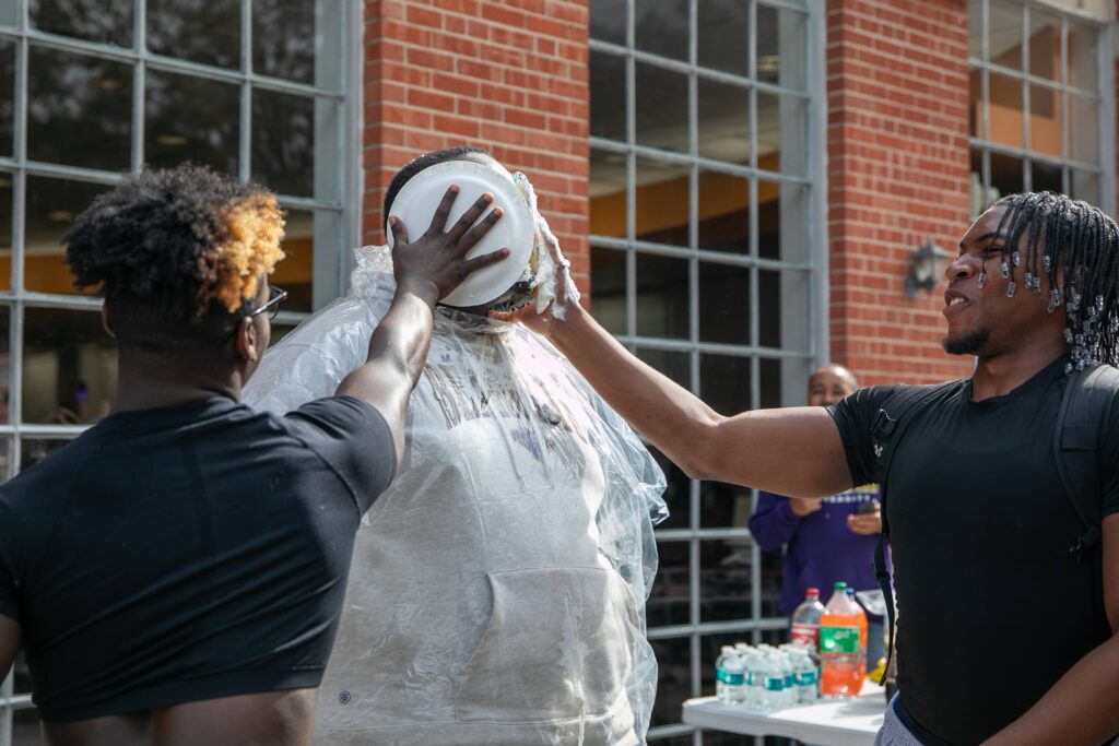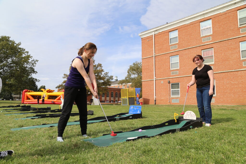 Fraternity Alpha Delta Gamma came through helping pass out the free pizza Mini Golf caused heated competitions! Faculty member Larry Davis got pied in the face!