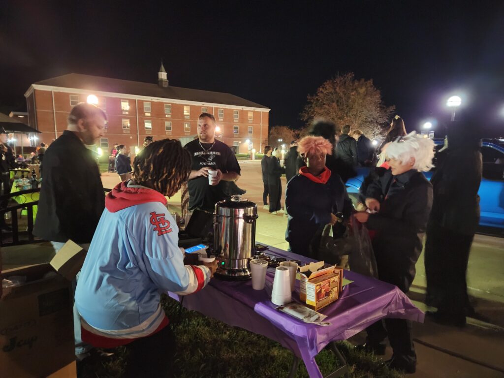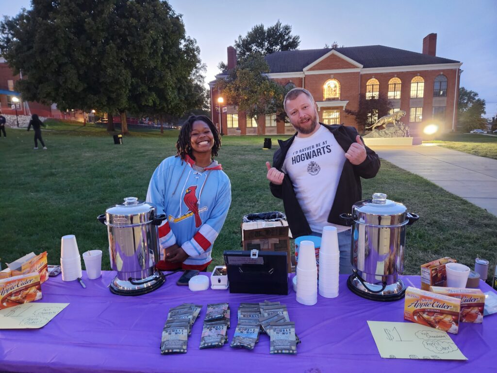 Psychology Club President Joylene Bills and Calvin Wertman sold hot chocolate and apple cider to visiting trick-or-treaters. The proceeds from their sales went towards Psychology Club and McKendree’s Bearcat Food Pantry.