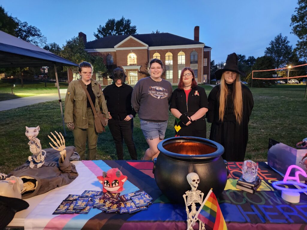Spectrum Alliance and Bearcat Gaming teamed up for their table! Pictured above are Lauren Magnussen, Izaiah Pope, Roxanne McWhorter, Lilyann Mullins, and Cathrine Houck. Their decor included pride flags and skeletons, with a cauldron full of candy and Pokémon cards!