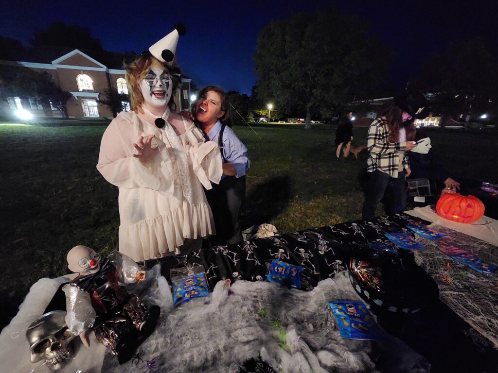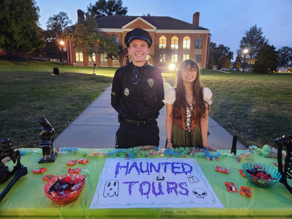 Following a “Witches & Wizards” theme, Residence Life’s booth was decorated with cauldrons and witchy decor. SRA Roxanne McWhorter and RD Emily Smith are featured above, along with Emily’s dog, Tiberius!
