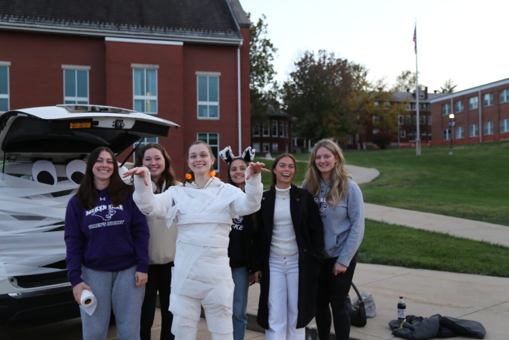 McKendree’s local sorority, Kappa Sigma Tau, dressed up and passed out candy. Above, members Morgan Fiscus, Aliyah Spencer and Gabriella Heinrich are pictured with “Alvin and the Chipmunks.”
