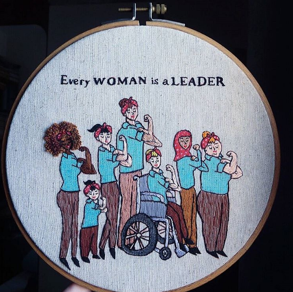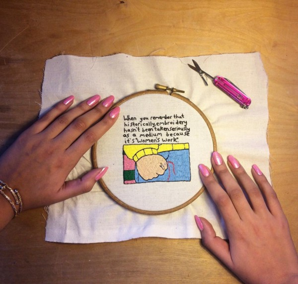 Hannah Hill, a 22 year old, London-based art student uses her art to bring awareness to subjects such as body-positivity, mental-health awareness and feminism. She uses the unique medium of embroidery to bring to light issues she sees in her own life. One of these issues is the lack of recognition women receive for embroidery as an art form because it is often deemed to be merely “woman’s work.” Late last year, social media spread a new meme “Arthur’s first” which commemorated a nostalgic TV show and provided a funny way to caption someone feeling frustrated or angry. Hill has been recognized and applauded for reinventing the meme in her own way, which took her 15 hours to complete. This piece of “feminist art meme,” as she phrases it, has been shared by public figures such as Planned Parenthood and The Huffington Post as being a modernized and comical call for social justice.