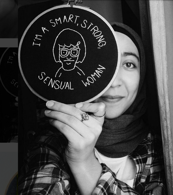 Deroui Safae is a young and self-taught embroiderer who is gaining more of a following on social media for her detailed and warranting designs. She continues to practice the art through embroidering different illustrators’ detailed images which she finds meaningful. She has replicated pieces relating to intersectional-feminism and Rosie the Riveter, as well as familiar television icons such as Bob’s Burgers’ Tina Belcher. While her more complex pieces seem to replicate those of other artists illustrations, what she chooses to memorialize are very empowering and individualistic pieces of art. On her own, she has managed to pick up a skill and make it look easy to create and replicate beautiful illustrations. She has also designed more simplistic pieces on her own, which read popular feminist sayings like “GRL PWR” or recite Beyonce’s “who runs the world: girls” lyrics.